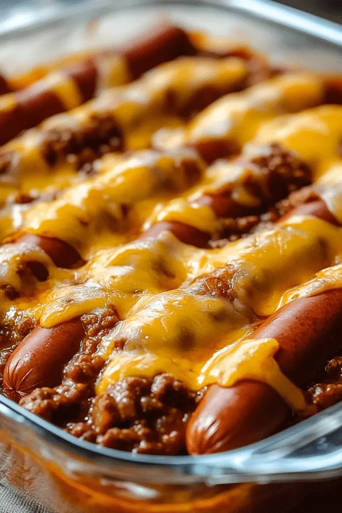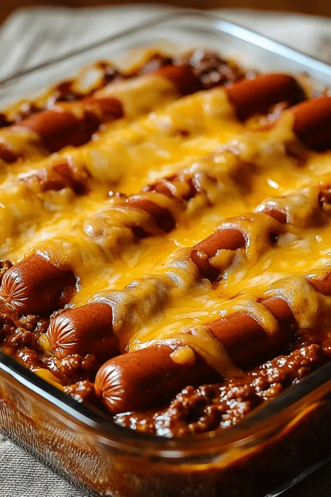 🌭 All-in-One Meal – Chili, dogs, and cheese layered together in one dish.