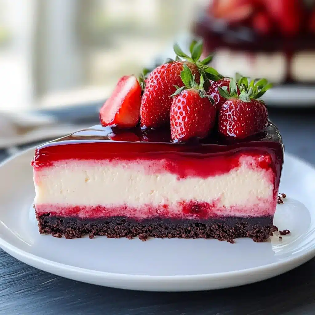 1. Stunning Presentation – With its eye-catching red layers and fresh strawberries, this cheesecake is a showstopper.