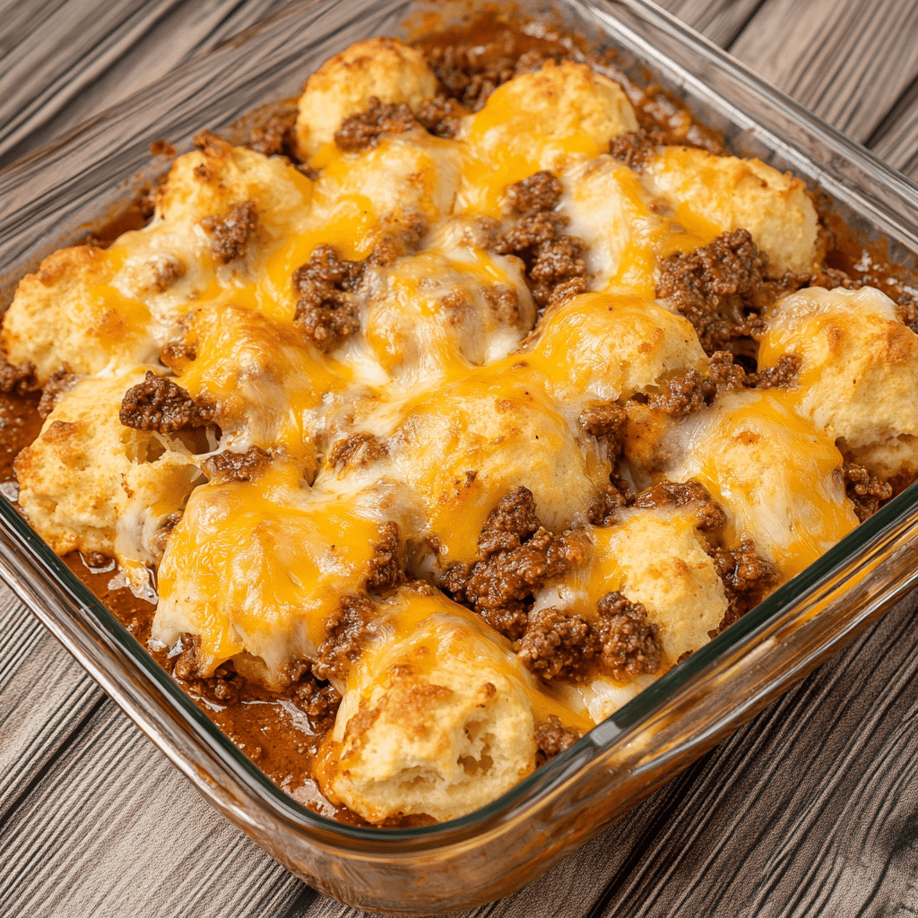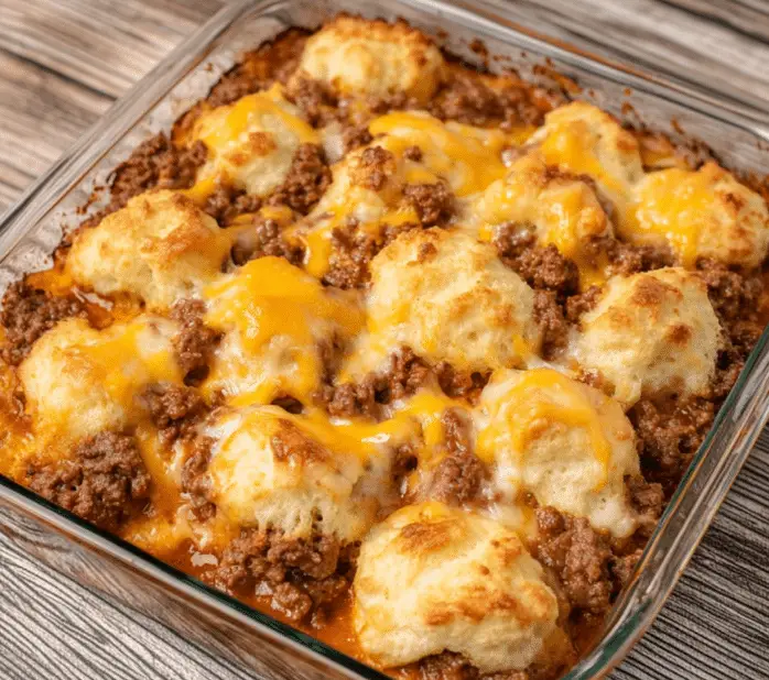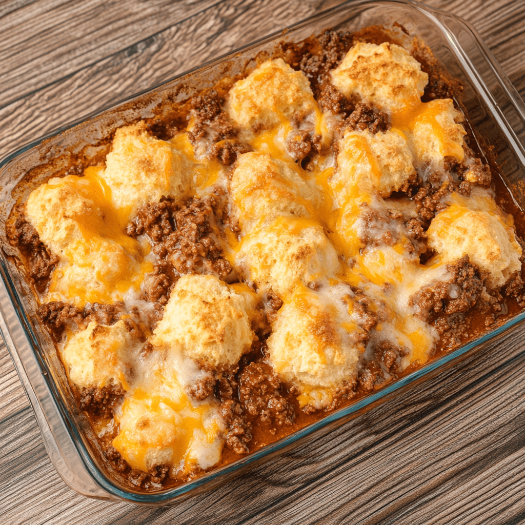 Tender biscuit scoops bubble up through a rich, saucy beef filling, all blanketed in melty cheddar and mozzarella cheese. It’s the homestyle casserole you didn’t know you needed — hearty, simple, and completely satisfying.